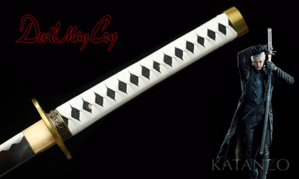 Echte Nachbildung des legendären Yamato Katana von Vergil aus der Videospielreihe "Devil May Cry". Mit einer Klinge aus 1045 Karbonstahl und einer schwarzen Holzscheide. detailgetreues Katana von Vergil aus Devil May Cry bekannt aus dem beliebten Action-Game echte 1045 Karbonstahl Klinge hochwertige Nachbildung mit optionalem Klingenupgrade handgeschmiedet in traditioneller Katana-Bauweise