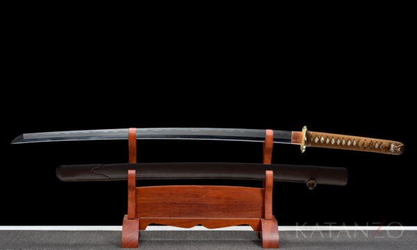Gunto Katana Das japanische Gunto Katana “Guntai Ken” steht in Japan für das “Militär Schwert”. Die Klinge des japanischen Katanas besteht aus 1095 Karbonstahl und wird traditionell lehmgehärtet, wodurch der prächtige und einzigartige Hamon beim “Guntai Ken” entsteht. Durch das mehrfache Falten der Klinge, entsteht das typische und einzigartige Damast Maserungsmuster.Die Klinge wird komplett in traditioneller Handarbeit hergestellt und mit echten, japanischen Wassersteinen rasiermesserscharf geschliffen. Die elegante Saya (Schwertscheide) besteht aus Eisen und verfügt über einen Echt-Leder Überzug. Die Tsuka (Schwertgriff) besteht aus Hartholz und wird traditionell mit echter Rochenhaut unterlegt. Das Ito (Griffband) besteht aus echter japanischer Seide und wird eng gewickelt. Das japanische "Guntai Ken" Katana verfügt über einen mechanischen Öffnungsmechanismus, der das Ziehen ohne Knopfdruck verhindert. Wird das Gunto-Katana in die Schwertscheide zurückgeführt, rastet der Verschluss ein und das Katana ist im gesperrten/gesicherten Modus.Durch das differentielle Härten (Lehmhärtung) ist die Klinge nachhaltig scharf und bleibt auch bei rauem Einsatz rasiermesserscharf. Mit dem japanischen General Schwert "Guntai Ken" gleiten Sie beim durch Bambus, wie durch Butter. Die vorzügliche Klinge, die Armaturen mit echtem Gold und die historische Optik, machen dieses Gunto-Katana zu einem echten Hingucker unter den Katanas der Premium-Klasse. “Die Wahrheit ist nicht das, was du möchtest. Sie ist, was sie ist, und du musst dich ihrer Macht beugen oder mit einer Lüge leben.“ (Miyamoto Musashi) Eigenschaften Handgeschmiedet nach traditioneller japanischer Art: Ja Techniktraining (Battodo): Ja Schnittübungen (Tameshigiri) : Ja Tsuka (Griff): Hartholz mit echter Rochenhaut überzogen Tsuba (Stichblatt): Messing mit Gold Fuchi (Griffzwinge): Messing mit Gold Kashira (Abschlusskappe): Messing mit Gold Menuki (Griffdekoration): Messing mit Gold Ito (Griffband): umwickelt mit japanischer Seide Saya (Scheide): Eisen Saya, mit Echt-Leder Überzug Sageo (Schwertscheidenband):Echt-Leder Gesamtlänge: 103 cm Klinge Material : 1095 Karbonstahl Tongehärtet (echter Hamon) : Ja Praktischer Einsatz ("Battle ready"): Ja Gefalteter Stahl : Ja Full-Tang : Ja Sandpolitur: Ja Schliff mit japanischen Wassersteinen: Ja Bo-Hi (Blutrille): Nein Klingenlänge: 71 cm Klingendicke: 7mm Klingenbreite: 3,2 mm Härte: 55 – 58 HRC