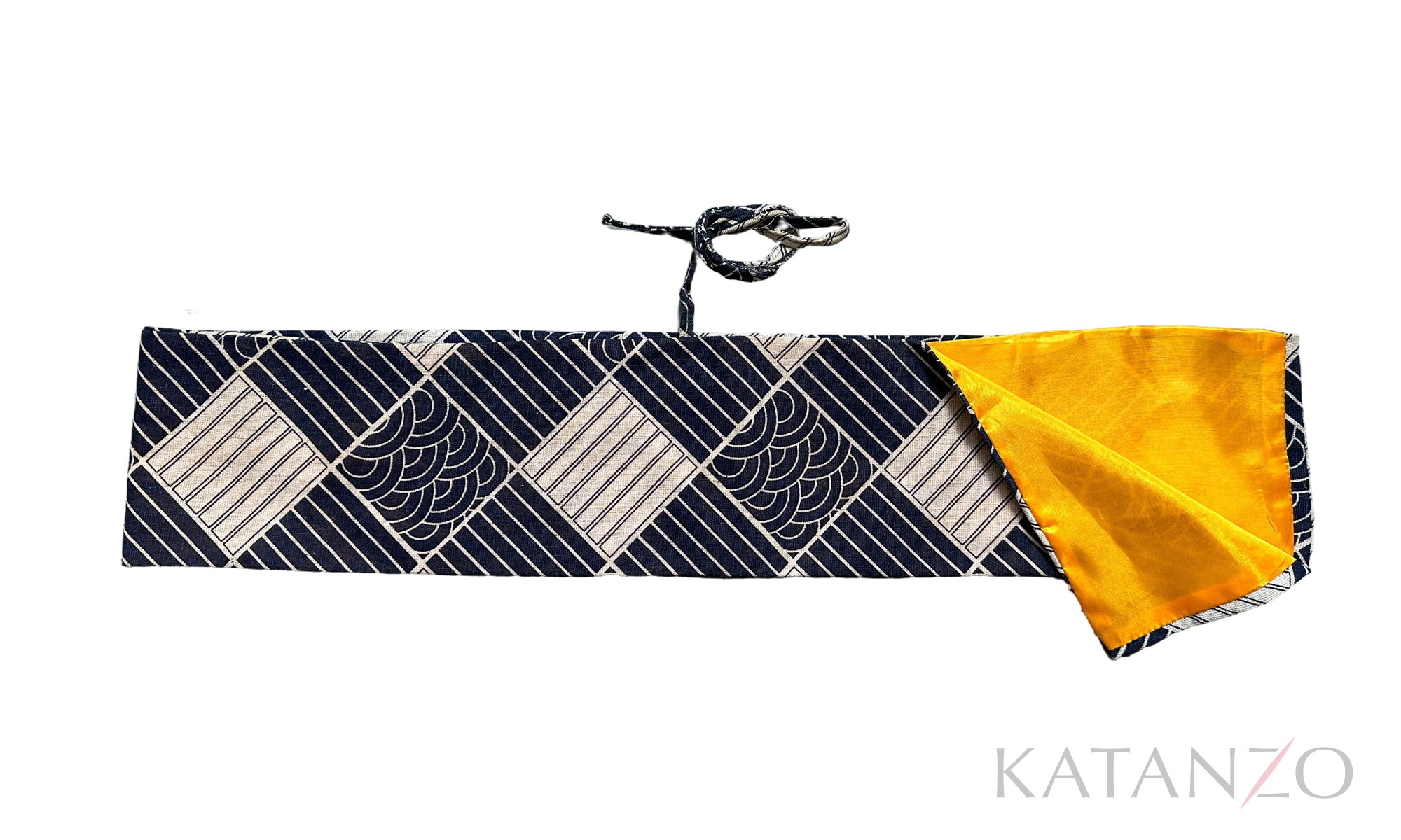 Elegante Schwerttasche aus dunkelblauem Stoff im geometrischen Kōshi-Muster mit goldfarbenem Innenfutter. Synthetischer Stoff in Brokatoptik Goldfarbenes Innenfutter Passend für Katana und Wakizashi