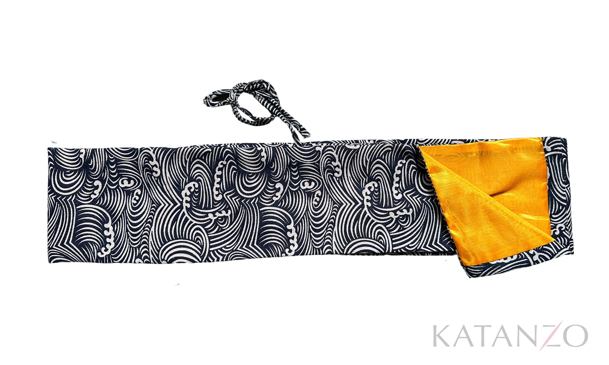 Schwerttasche in Dunkelblau mit dynamischem Wellenmuster und goldfarbenem Innenfutter. Synthetische Seide (Brokatoptik) Goldfarbenes, weiches Innenfutter Ca. 140 × 15 cm – passend für Katana & Wakizashi Stoffkordel zum Verschließen