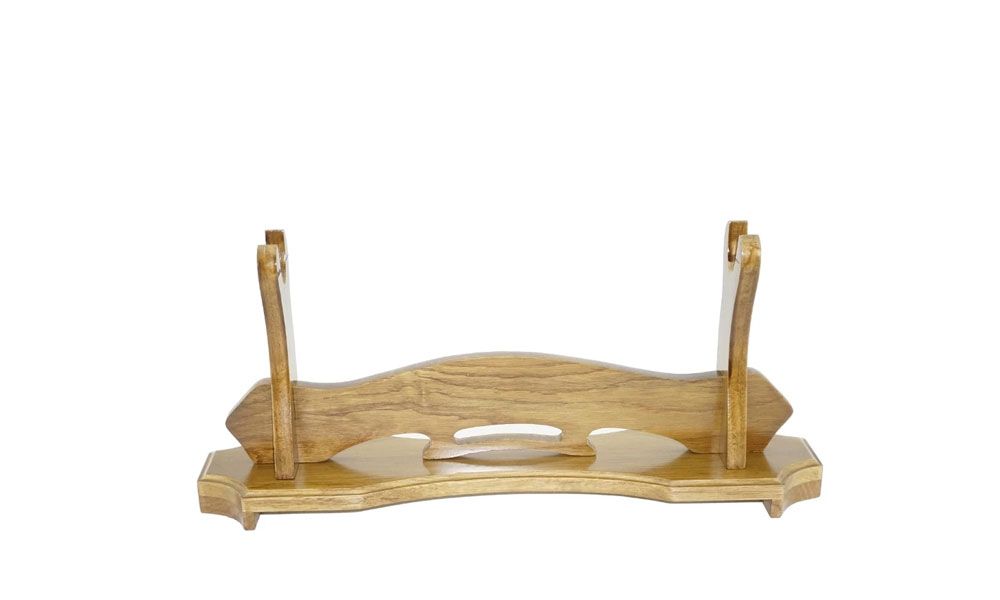 Katana Kake Der Katana Tisch-Ständer "Katana Kake" aus lackiertem Echtholz bietet sich perfekt an, eines Ihrer japanischen Schwerter zu präsentieren. Das elegante und hochwertige Design lenkt die Blicke auf das Schwert. Der Katana Schwert-Ständer besteht aus echtem Holz und wurde transparent lackiert. Premium Katana-Ständer aus Echtholz hochwertiges und simples Design Tisch-Ständer für ein Katanas Schwert-Ständer aus Holz, transparent lackiert einfaches Zusammenbauen, 3 teilig Grösse: 34 cm * 9 cm * 22 cm Gewicht: ca. 520 g