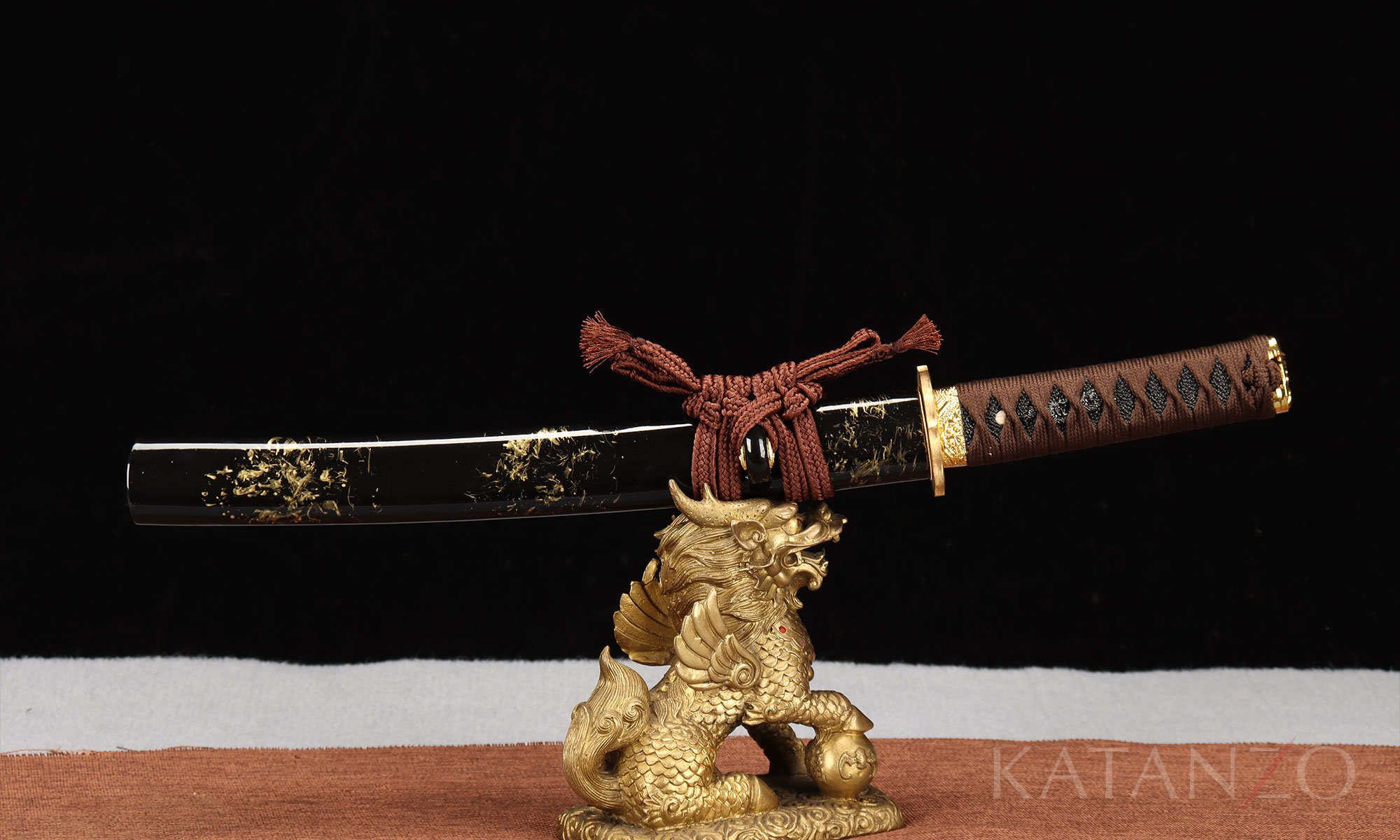 Aussergewöhnliches, japanisches Adler-Tanto mit einer Klinge aus T10 Stahl und einer umwerfenden Saya. umwerfende, schwarze Echtholz Saya mit goldigem Muster Klinge aus T10 Stahl mit imitiertem Hamon enge Wicklung aus echter japanischer Seide auffällige und schöne goldene Tsuba aus Messing